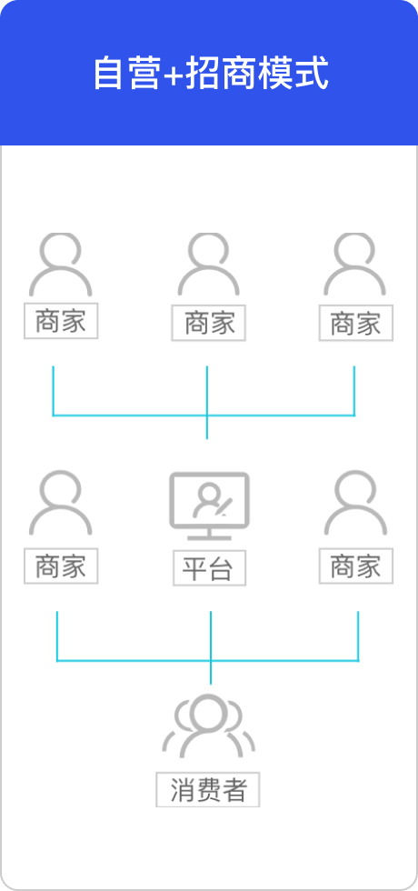 类似京东或天猫的运营模式,企业可构建平台型商城整合多家商家入驻到平台开店,同时也支持自营