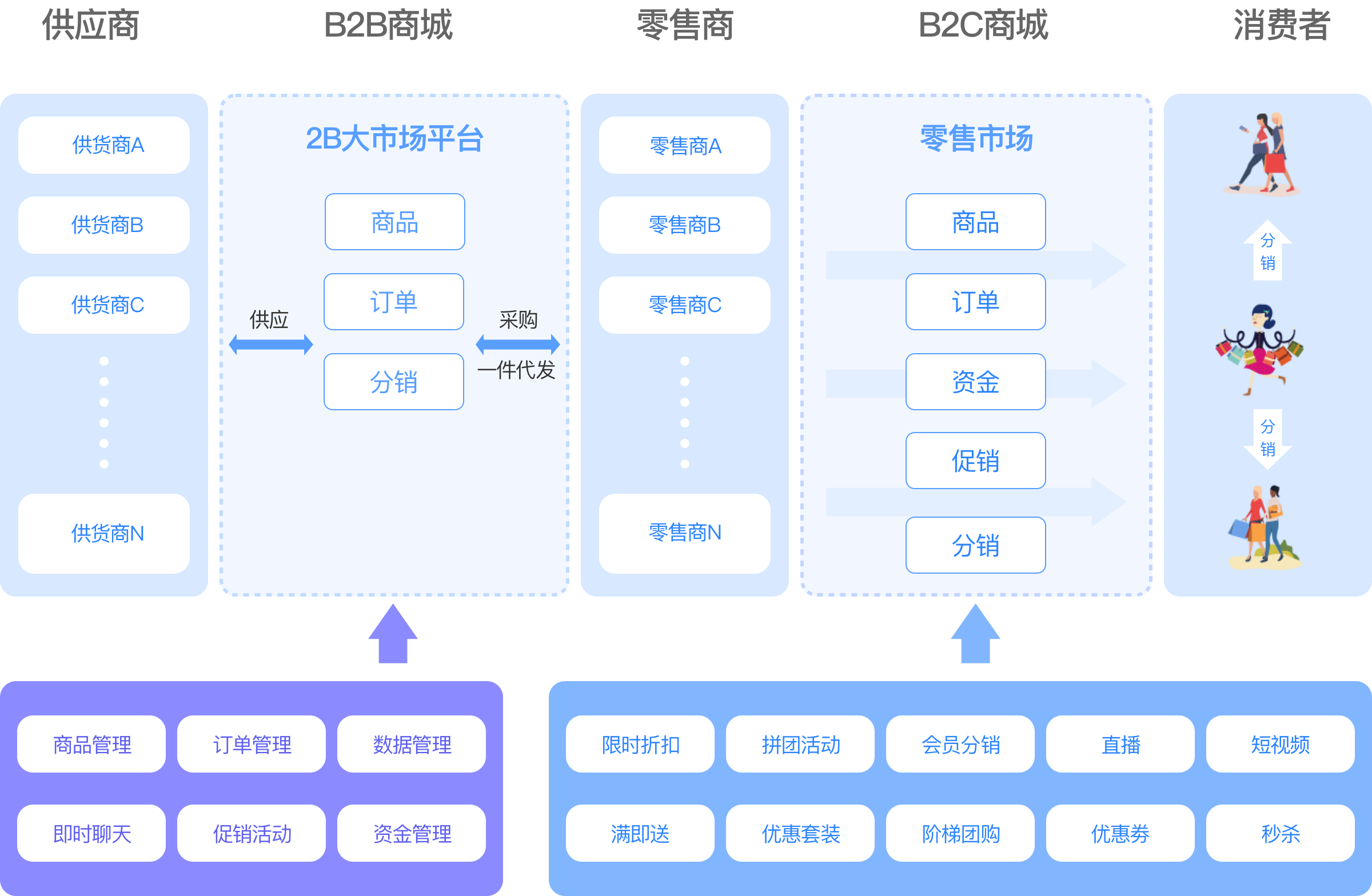系统支持b2b2c/s2b2c/s2b/b2b/社交电商等多种运营模式